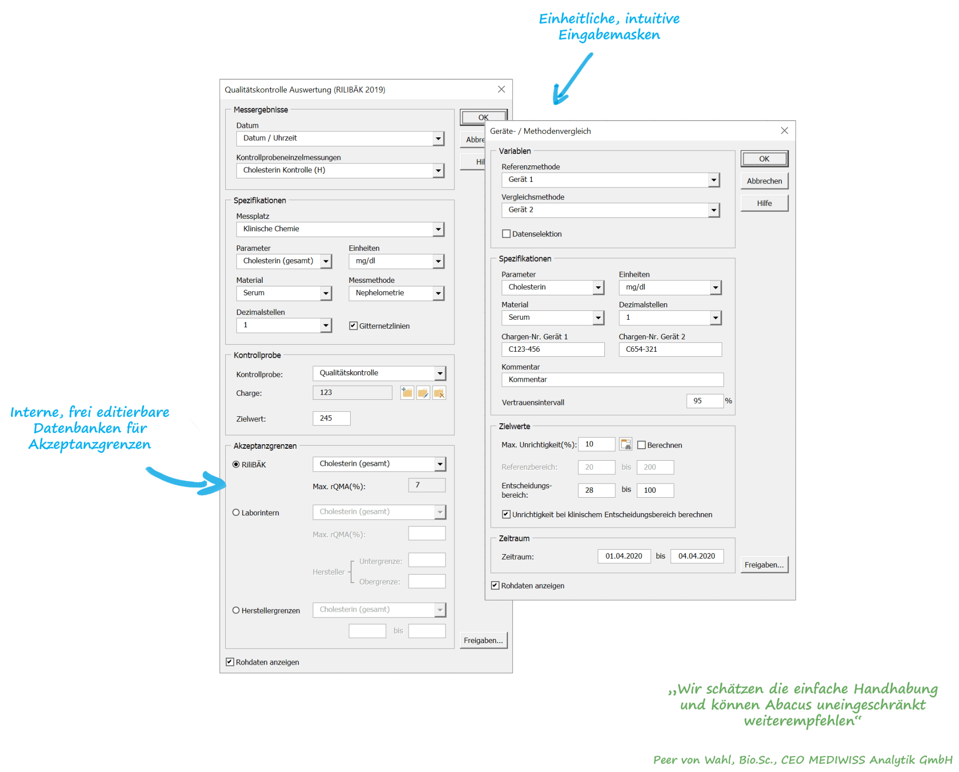 Dokumentieren Sie mit Abacus 3.0 ganz einfach die Ergebnisse Ihrer internen Qualitätskontrolle nach den Vorgaben der aktuellen RiliBÄK.
