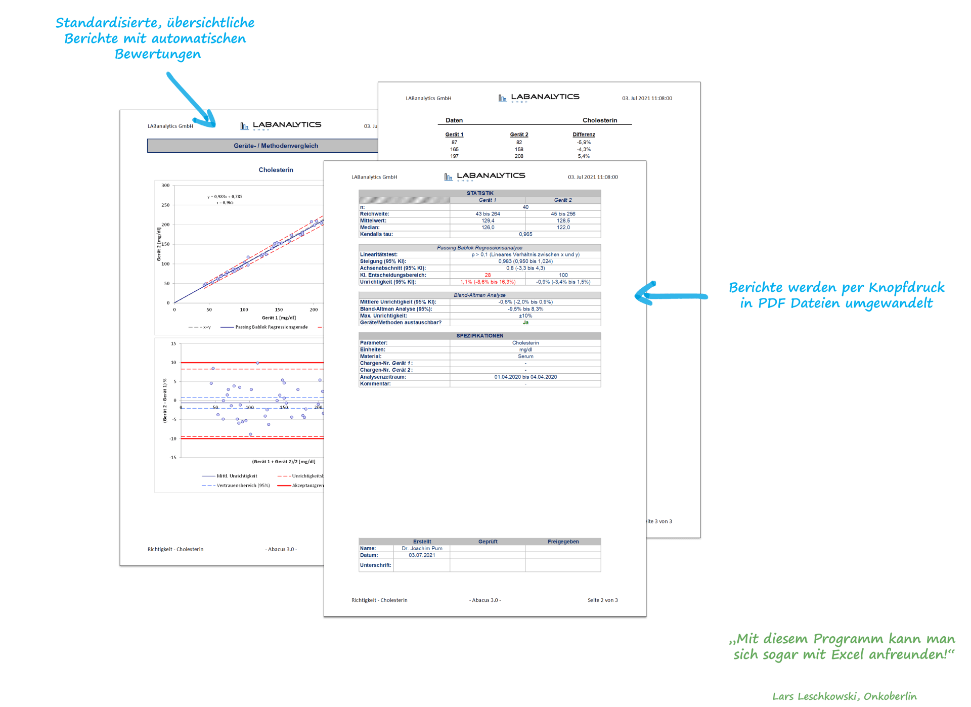 Methodenvalidierung und interne Qualitätssicherung nach RiliBÄK 2019 einfach gemacht: Auswertungen werden automatisch mit Ihrem Logo und Angaben zu Ihrer Einrichtung druckfertig formatiert. Selbstverständlich werden dabei alle vom Gesetzgeber und den Behörden an das Labor gestellten Anforderungen für die Methodenvalidierung von Laboratory Developed tests (LDTs), die Methodenverifizierung von CE-zertifizierten Verfahren und die interne Qualitätssicherung nach RiliBÄK berücksichtigt. Alle statistischen und mathematischen Algorithmen wurden auf Basis des aufwendigen GAMP-5 Standards („Good Automated Manufacturing Practice“) validiert und auf CFR Part 11 Konformität überprüft. Demzufolge ist Abacus 3.0 auch in regulierten Bereichen einsatzfähig.